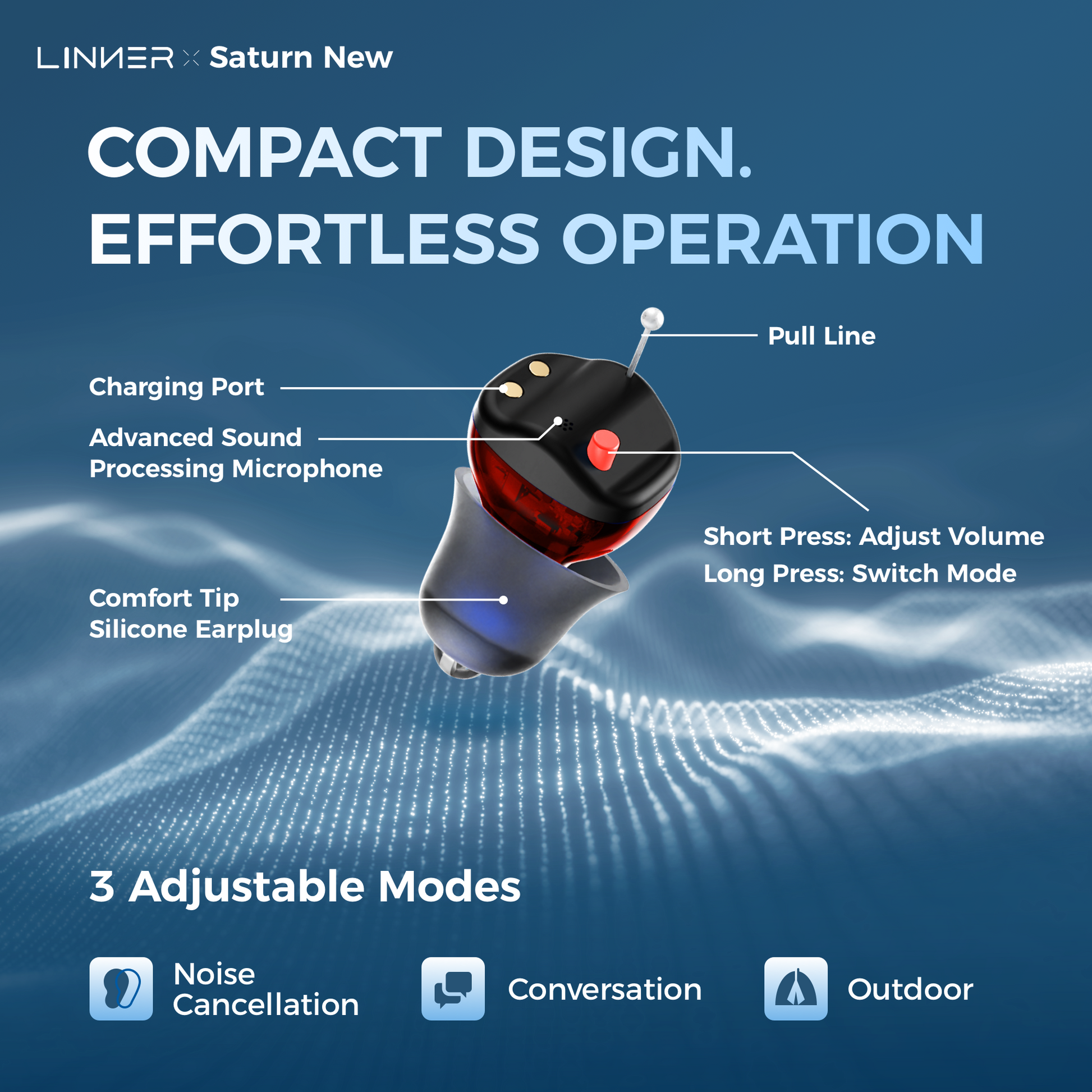 Additionally, while Linner Saturn is a CIC hearing aid, it also shares some of the advanced acoustic technologies often found in RIC (Receiver in Canal) hearing aids, providing users with a rich and clear sound experience.